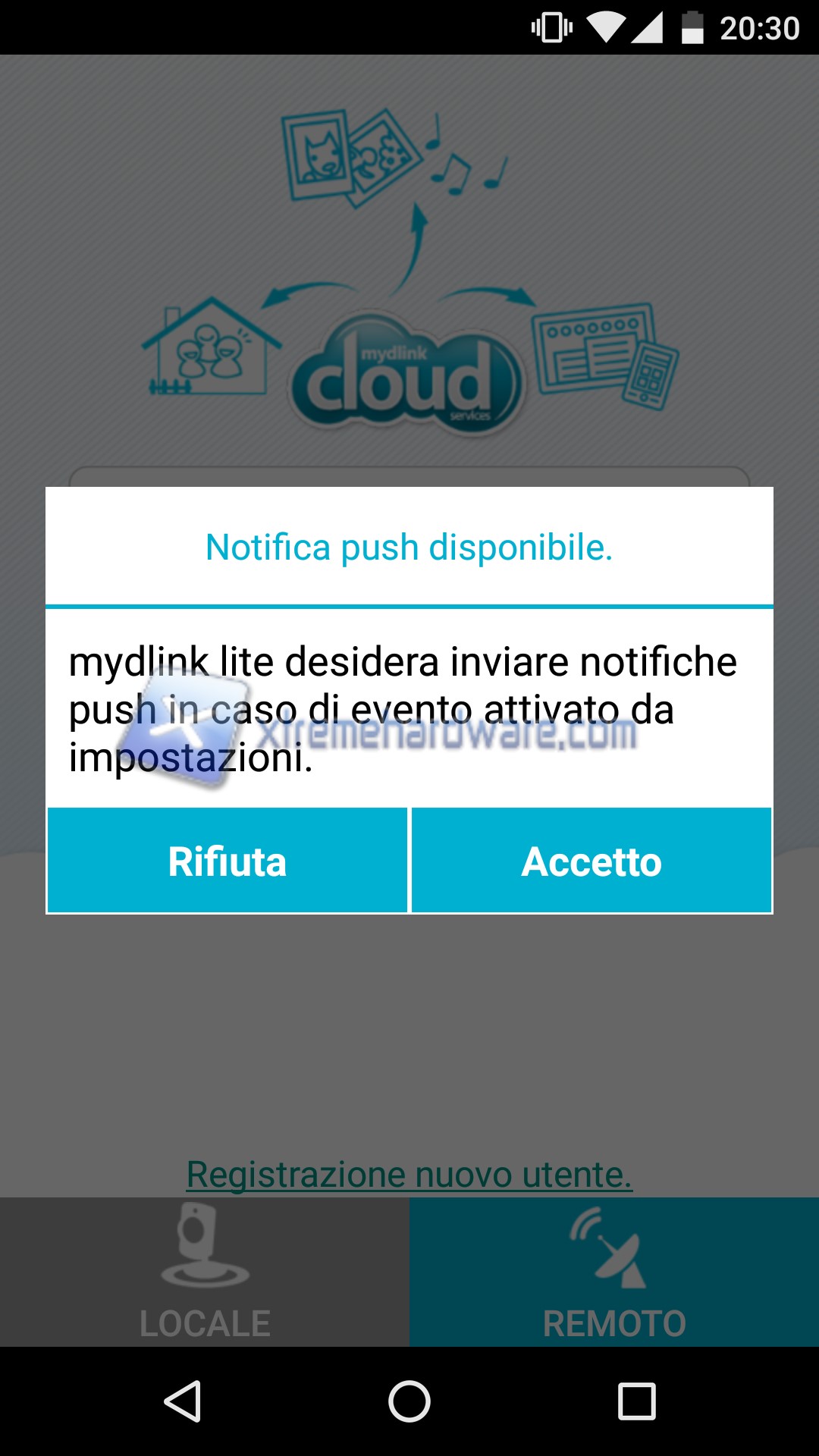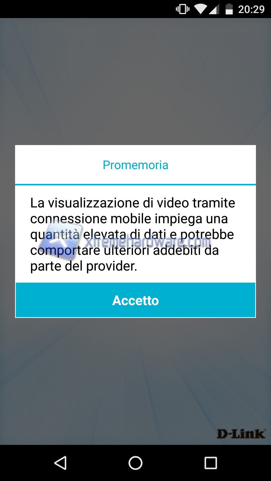 Per poter utilizzare la Mini videocamera D-Link DCS-8000LH dovremo scaricare sul nostro Smartphone o Tablet, direttamente dal Play store o App Store, l’applicazione mydlink Lite. Una volta installata e avviata verremo accolti nel Menù principale dove riceveremo un avviso relativo la visione di video e costi su rete dati.
