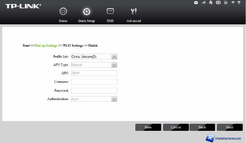 La schermata Dial-up Settings (Internet) mostra il profilo del provider proprietario della SIM card inserita. Fare clic su Next (Avanti) per confermare, oppure fare clic su New (Nuovo) per creare un altro profilo.